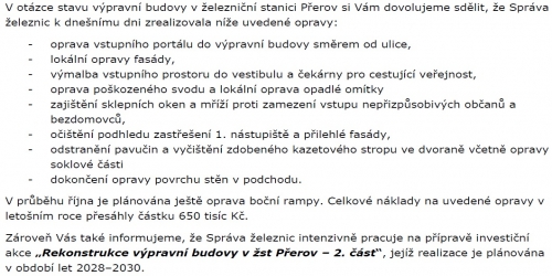 VÍCEMěla jsem schůzku s generálním ředitelem Správy železnic panem Svobodou o současném nežádoucím stavu železniční stanice v Přerově a její budoucnosti.